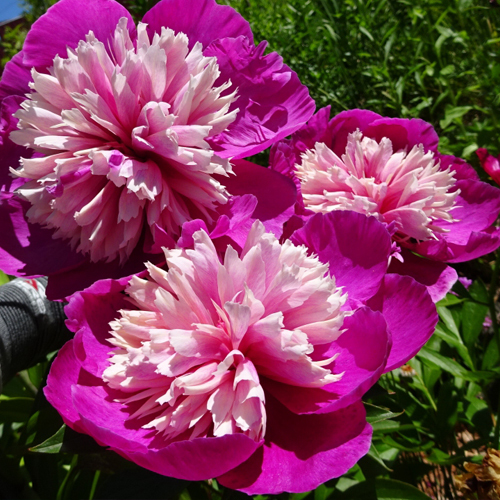• двухцветный пион с цветком в диаметре 15 см, окрас светло-розовый в сочетании с ярко-малиновым цветом (см. фото);