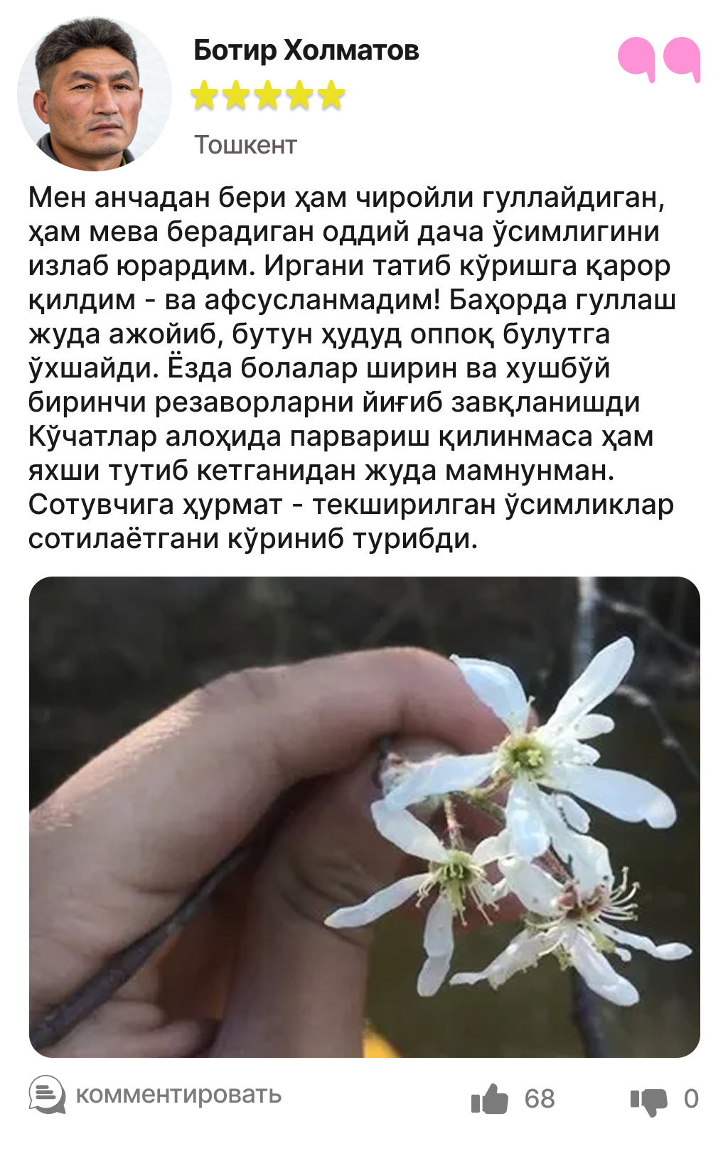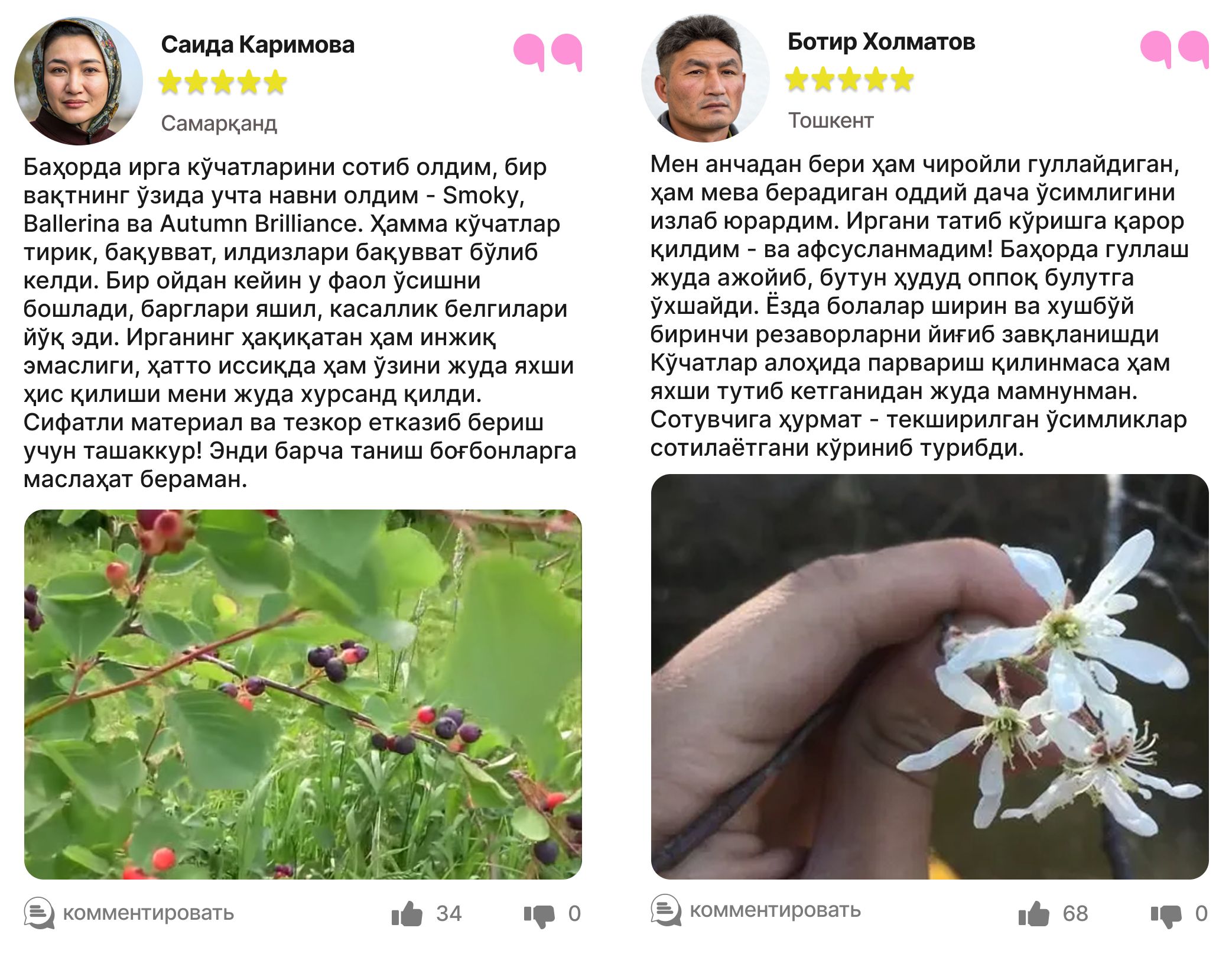 Харидорларимиз сотиб олинган ва етиштирилган ирга кўчатлари ҳақидаги таассуротлари билан ўртоқлашмоқда.